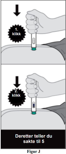 c. Etter at du hører det andre høye “klikket”, fortsetter du å holde den ferdigfylte pennen hardt mot huden og teller sakte til 5 for å sørge for at du injiserer hele dosen.