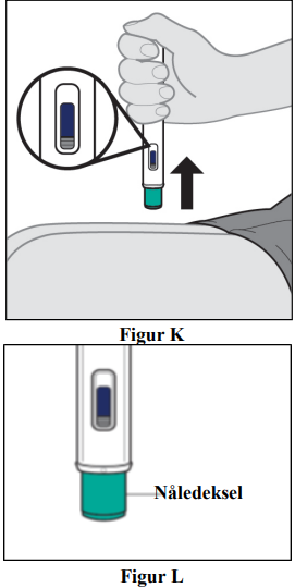 a. Hold den ferdigfylte pennen med hetten på i den ene hånden. Dra hetten forsiktig av med den andre hånden.