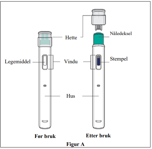 b. Se på den ferdigfylte pennen og sjekk at den ikke har sprekker eller er skadet. c. Sjekk utløpsdatoen på etiketten på den ferdigfylte pennen. Bruk ikke den ferdigfylte pennen hvis: